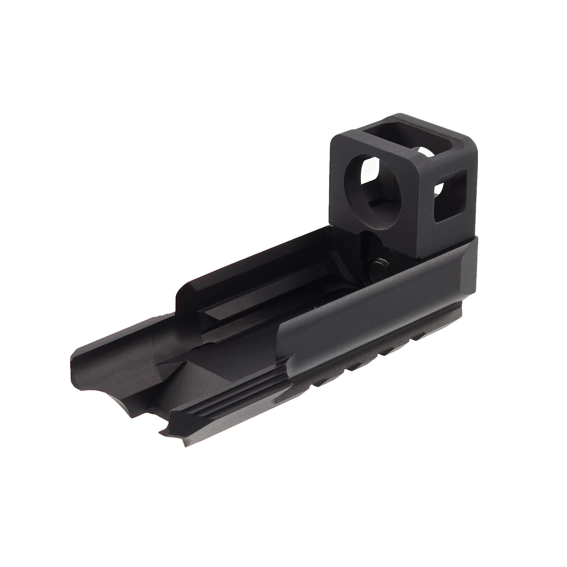 This 50 state legal compensator is made for unthreaded barrels and is anodized black. It has an ambidextrous serrated thumb rest lower and modular interchangeable uppers. The lower was painstakingly designed with radiuses that match the frame so that it looks and feels like a seamless integration.