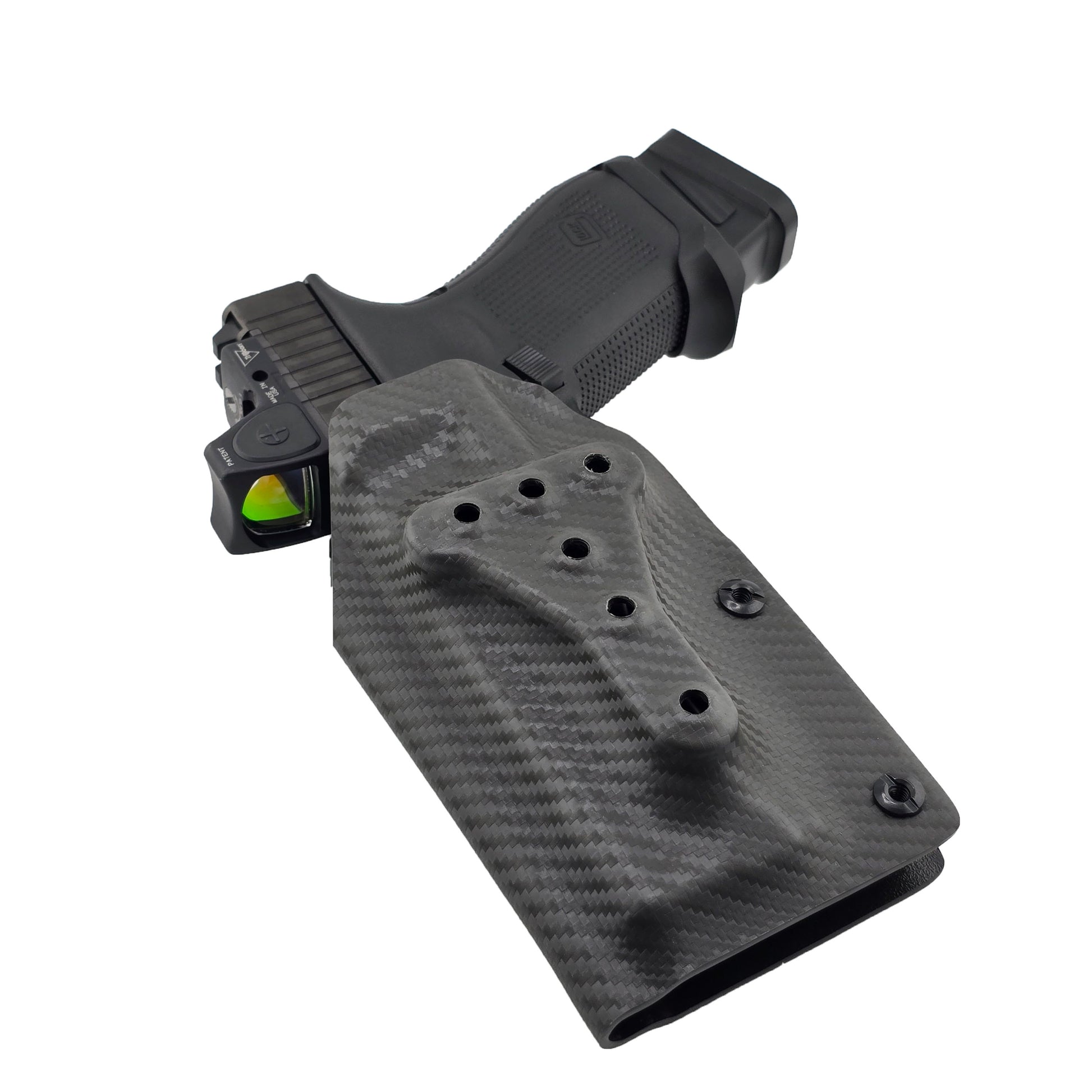 Our holster is constructed from .080 Kydex and is available in a range of colors as well as Holstex for the carbon fiber print. Two tensioner screws allow you to adjust the draw resistance all the way from zero resistance for quick draw drills to positive-click firm engagement for when you are mobile and running a primary.