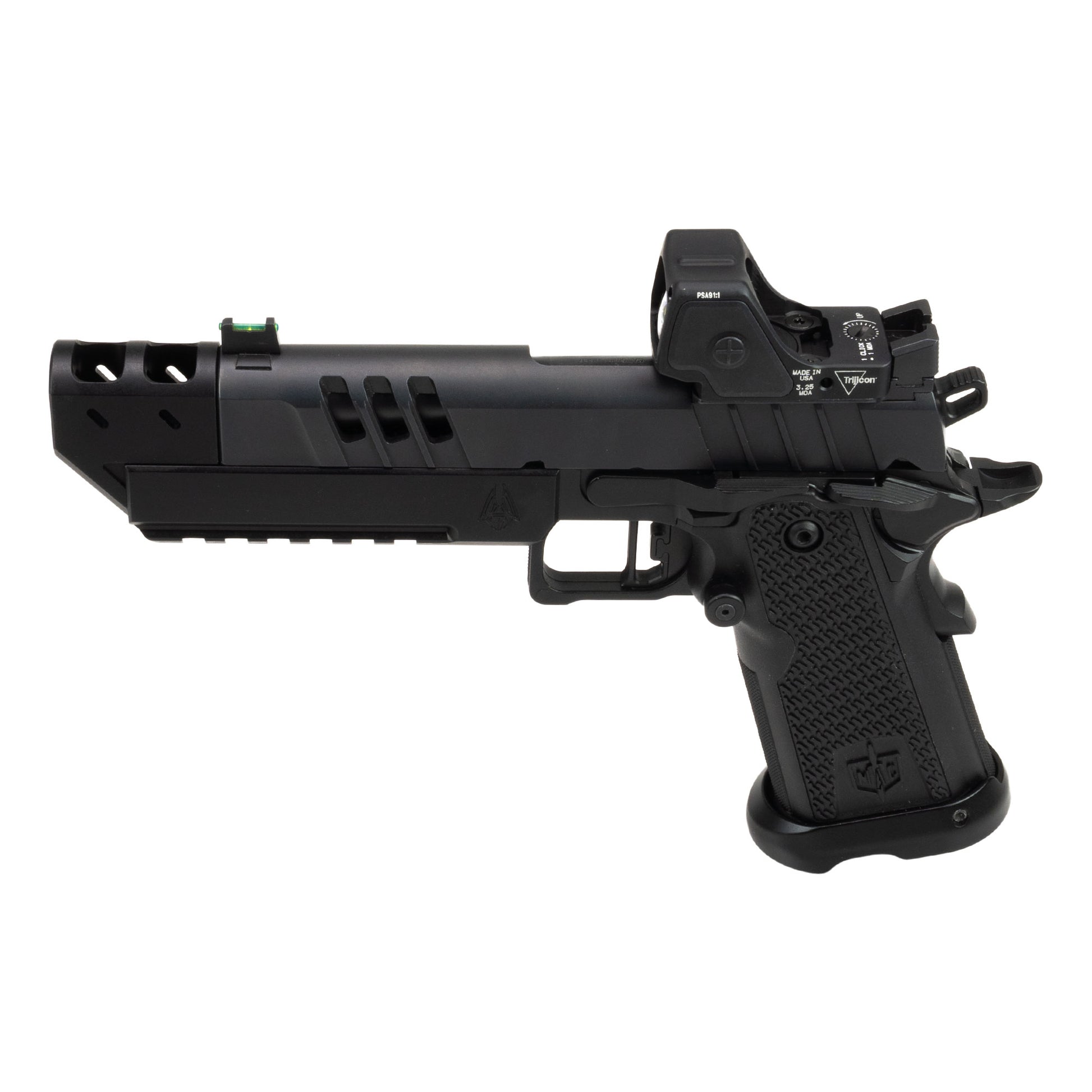 Adding a compensator to a pistol reduces muzzle flip and recoil energy, as a result recoil spring tuning will be required and we offer a spring set for this purpose.
