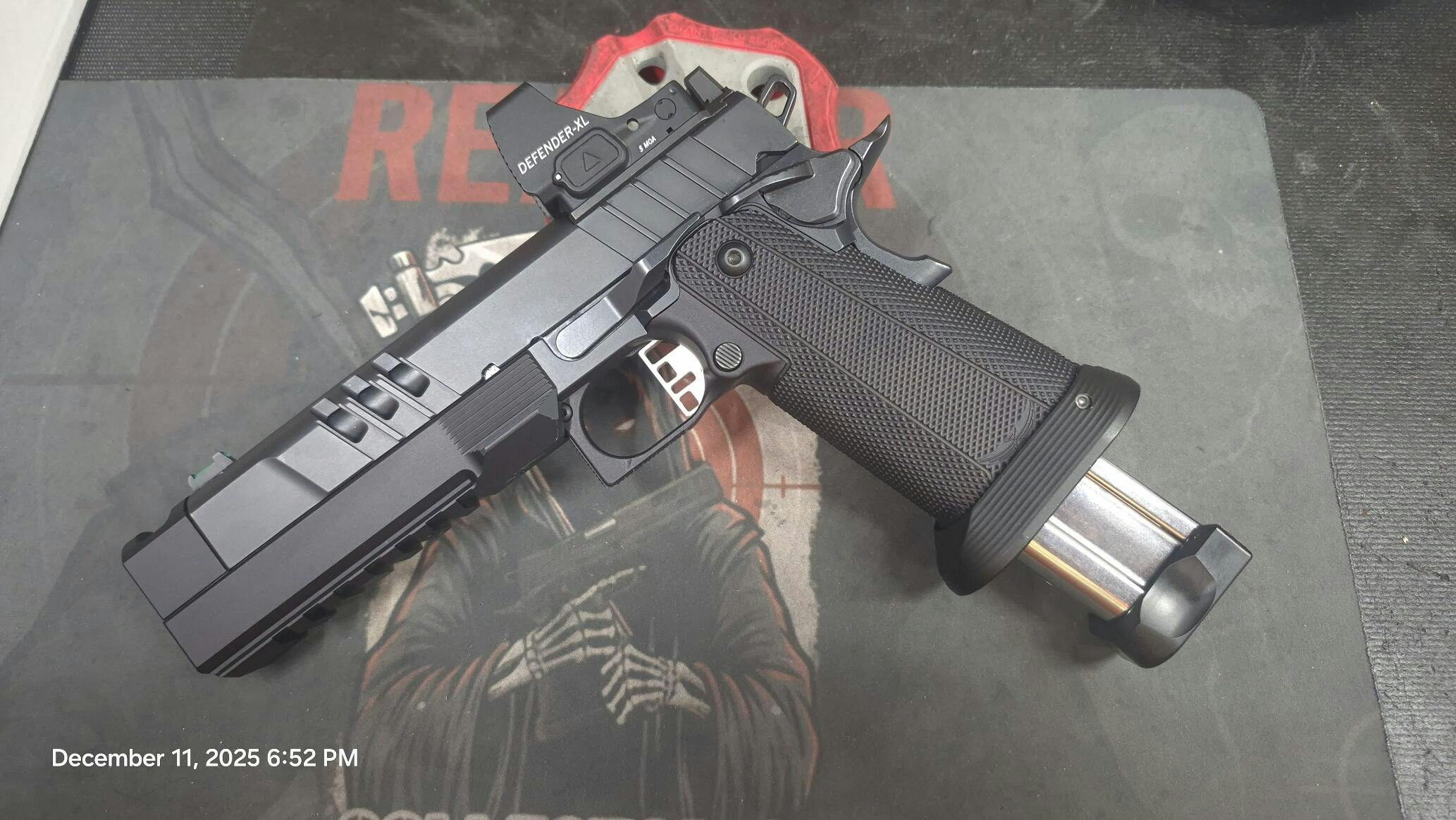 The Underworld Arms Cyclops Compensator for the Military Armament Corp 5" MAC 9 DS 1911, is a frame mounted compensator with a large expansion chamber that redirects the gas into a single top port that is similar in size to the Staccato XC and Sand Hawk.