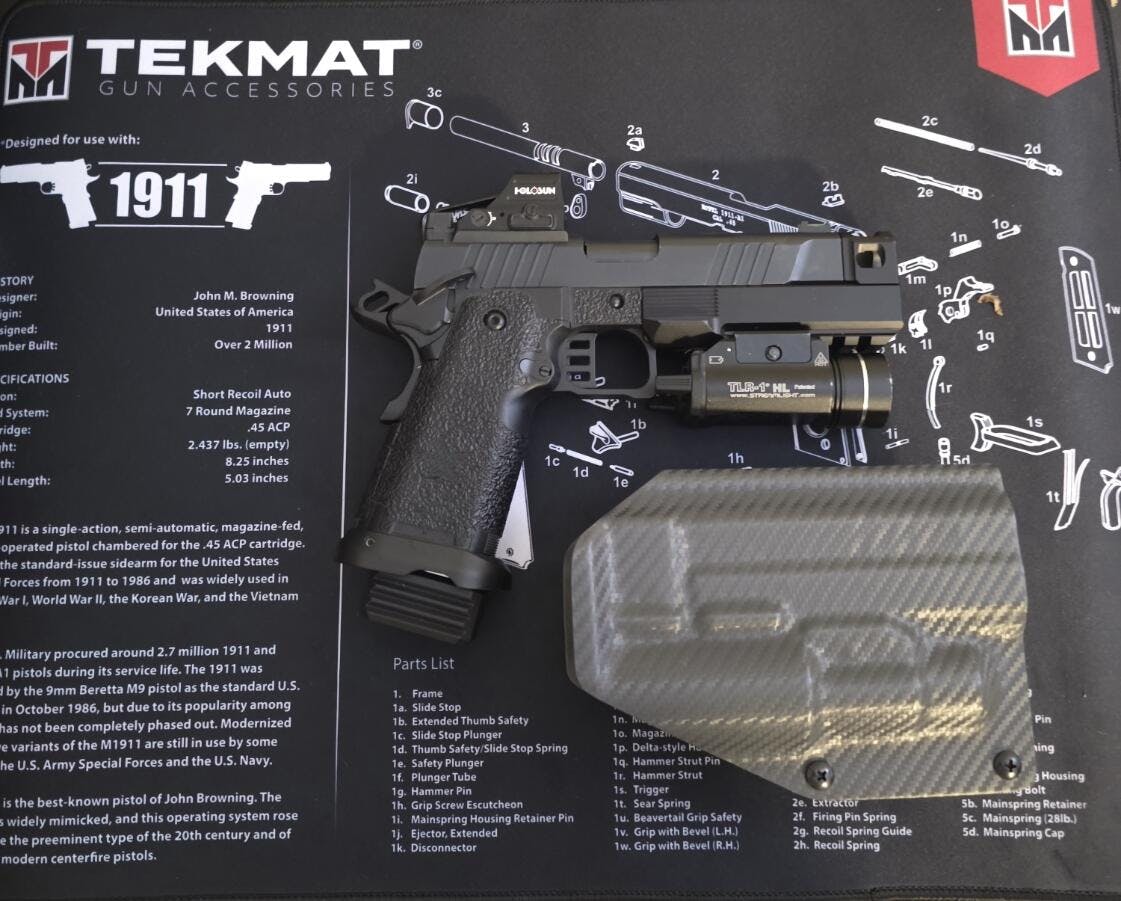 This compensator increases the dimensions of the firearm so it requires a dedicated holster such as the ones we make, or a universal holster such as the MSP Tier 1, and the blackhawk omnivore light bearing.