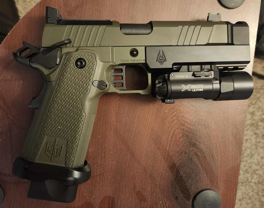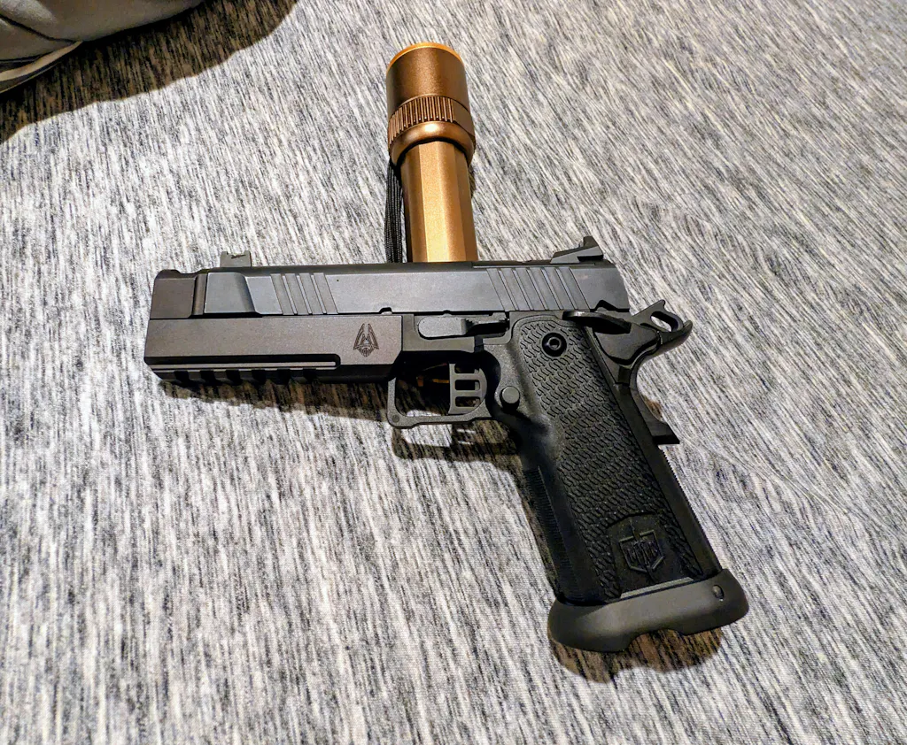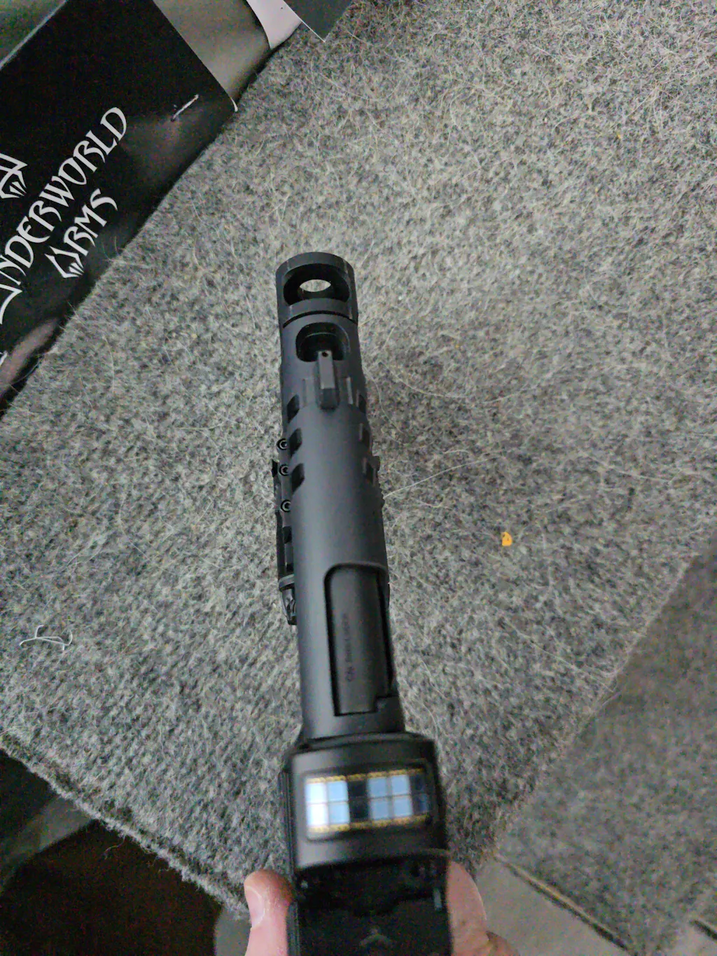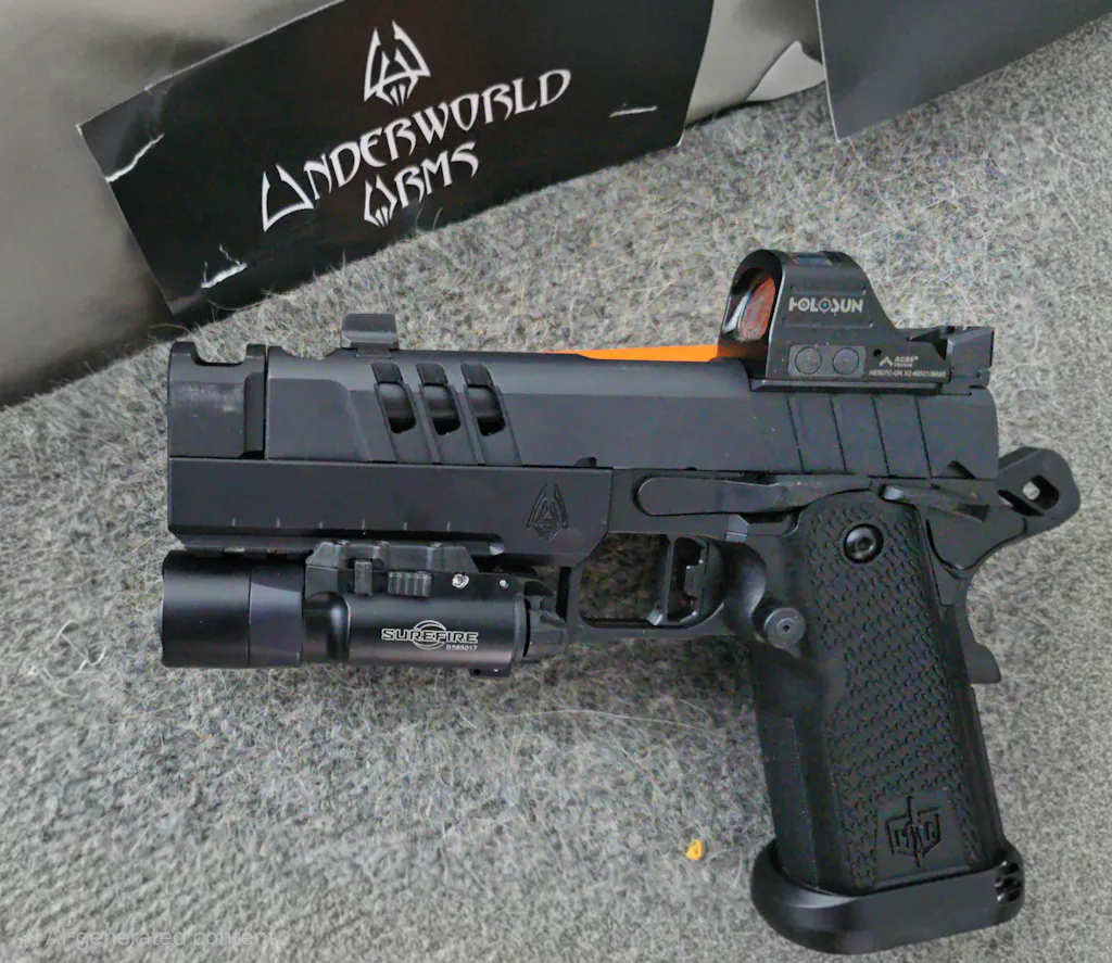 The Underworld Arms Cyclops Compensator for the Military Armament Corp MAC 9 DS 1911, is a frame mounted compensator with a large expansion chamber that redirects the gas into a single top port that is similar in size to the Staccato XC and Sand Hawk.