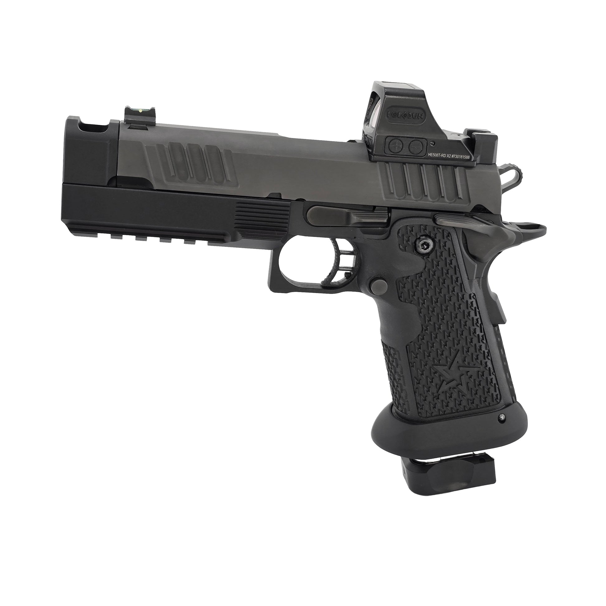 This 50 state legal compensator is made for unthreaded barrels. The Cerberus is available anodized black or cerakote DLC Grey. This compensator has an ambi thumb ledge lower with horizontal serrations that match the horizontal serrations on the slide release and thumb safety which creates a cohesive aesthetic.